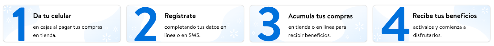 To earn benefits from your purchases, you must provide your cell phone number at checkout or register your purchases online. The benefits will be delivered at checkout when giving the number in a purchase, or could be activated trough the landing page bodegaaurrera.com.mx/beneficios and walmart.com.mx/beneficios based on the advance given by registered purchases.